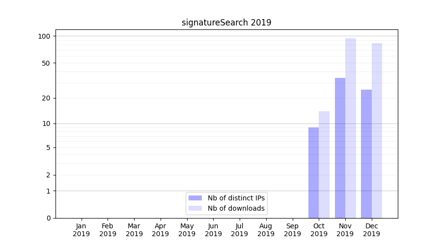 Number of downloads for software package signatureSearch, year by year, from 2025 back to 2014 (years with no downloads are omitted):
