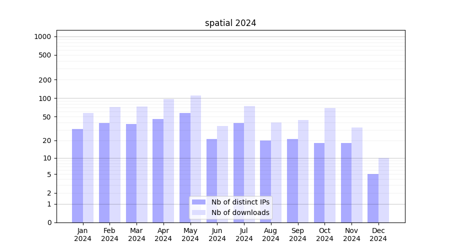 Number of downloads for software package spatial, year by year, from 2025 back to 2014 (years with no downloads are omitted):