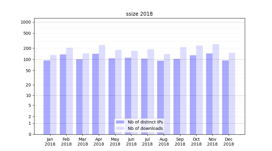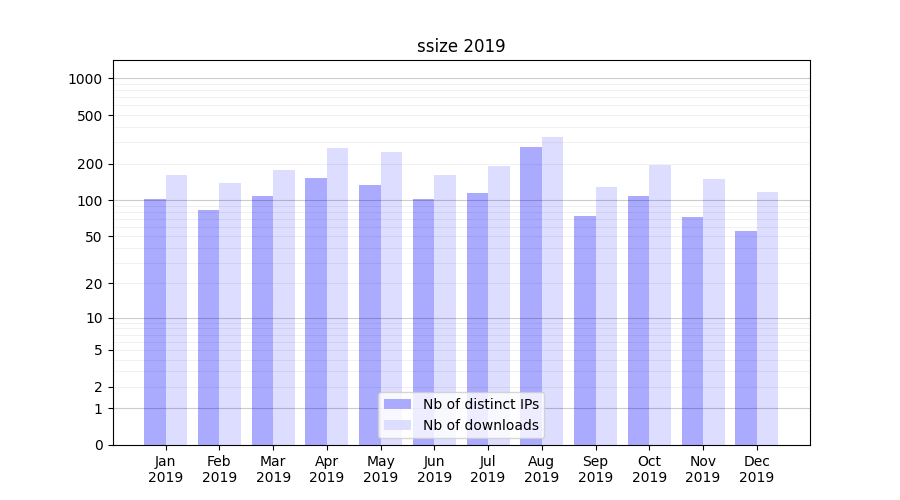 Number of downloads for software package ssize, year by year, from 2025 back to 2014 (years with no downloads are omitted):
