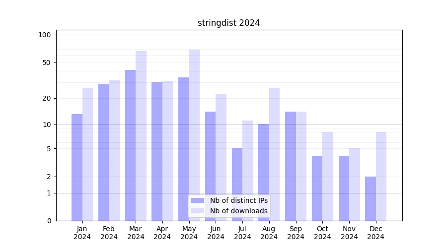 Number of downloads for software package stringdist, year by year, from 2025 back to 2014 (years with no downloads are omitted):
