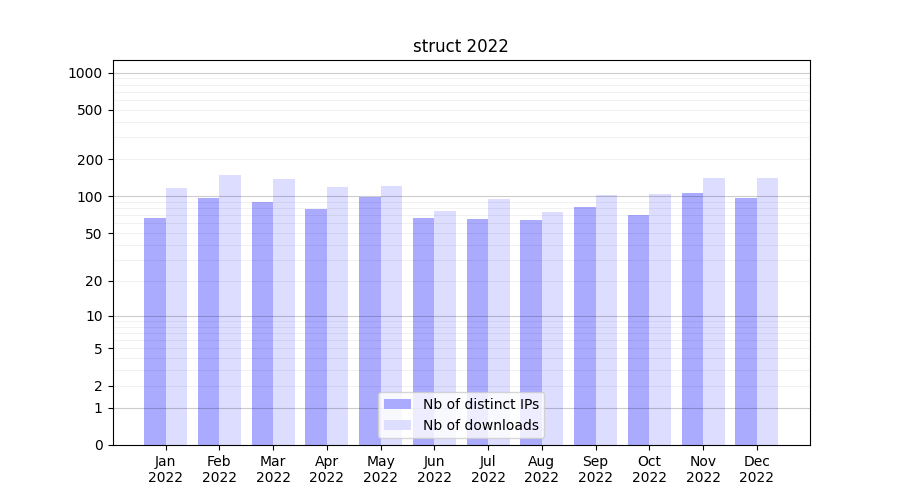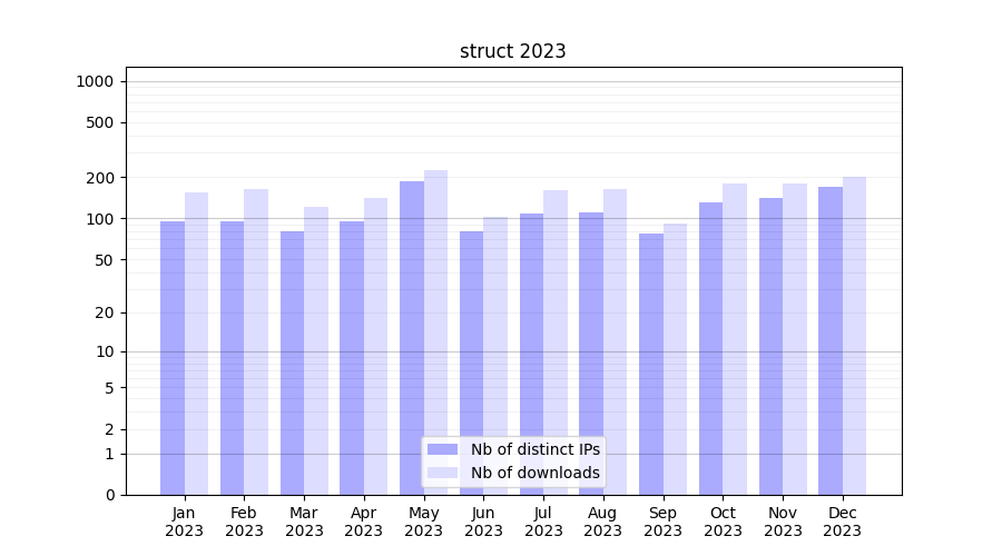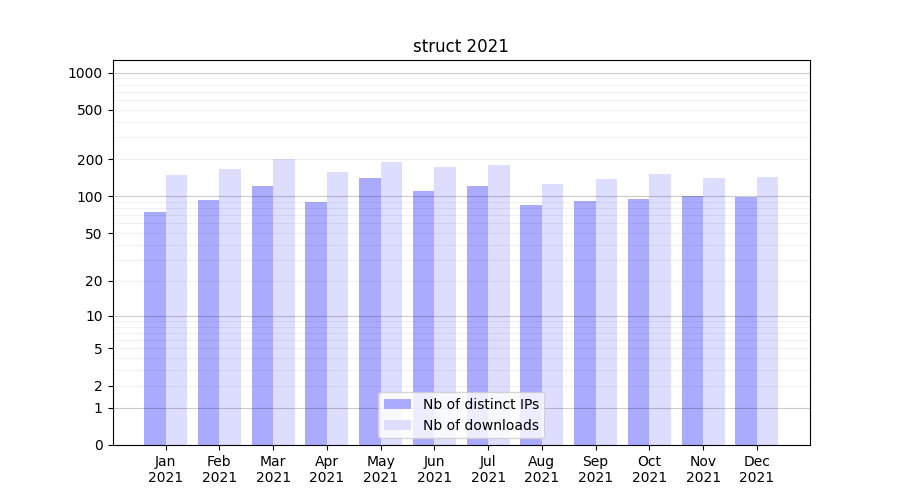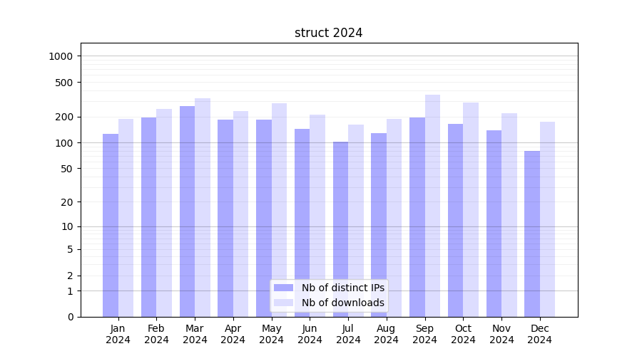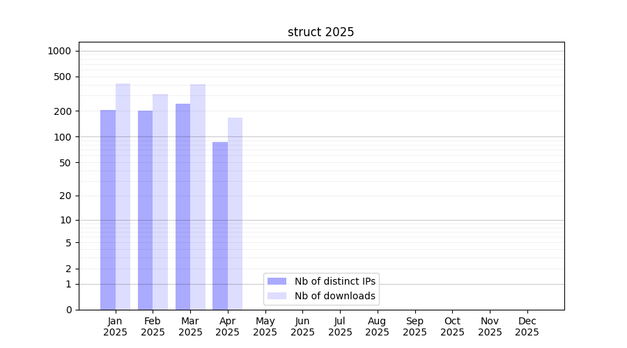 Number of downloads for software package struct, year by year, from 2025 back to 2014 (years with no downloads are omitted):