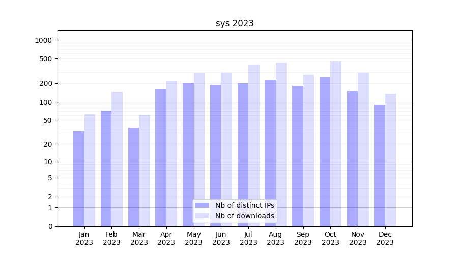 Number of downloads for software package sys, year by year, from 2025 back to 2014 (years with no downloads are omitted):