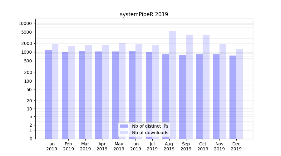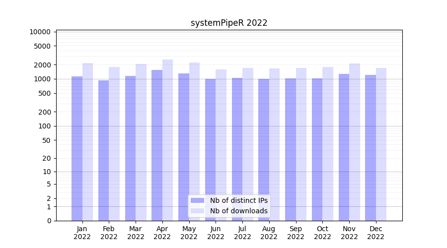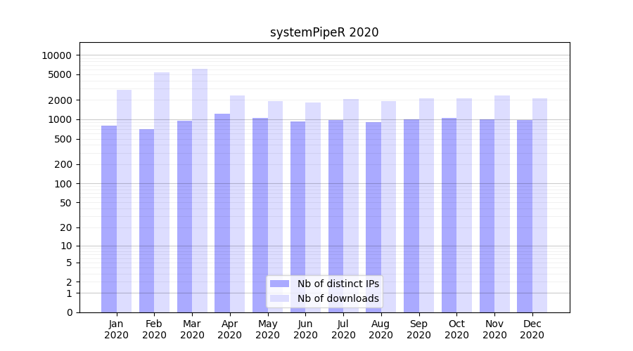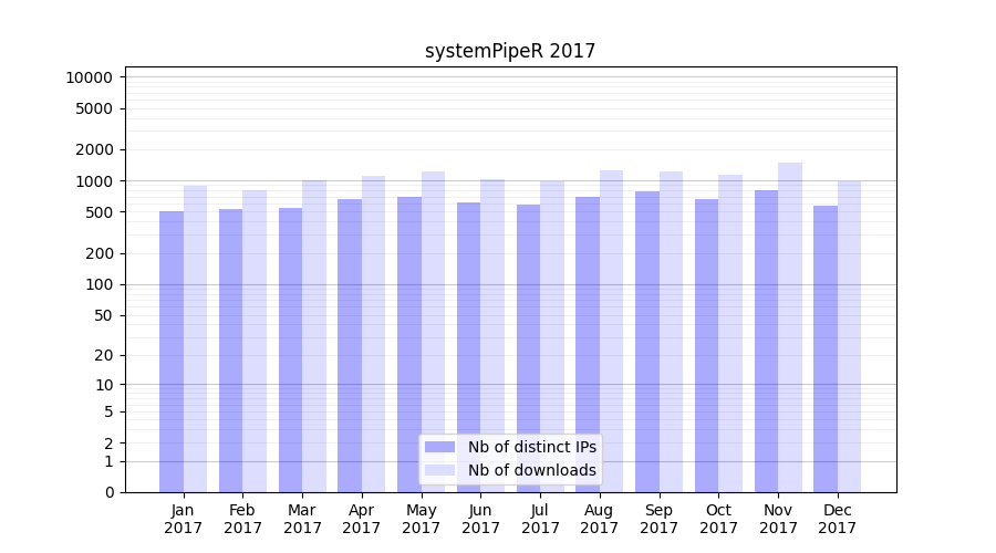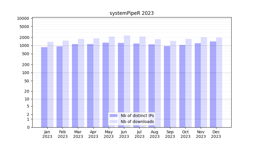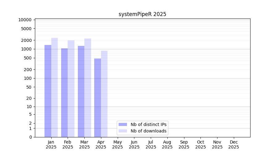Number of downloads for software package systemPipeR, year by year, from 2025 back to 2014 (years with no downloads are omitted):