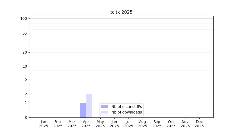 Number of downloads for software package tcltk, year by year, from 2025 back to 2014 (years with no downloads are omitted):