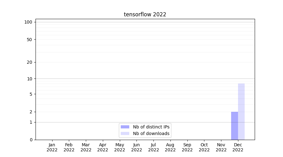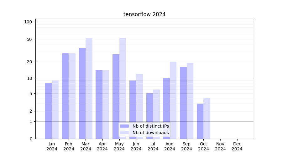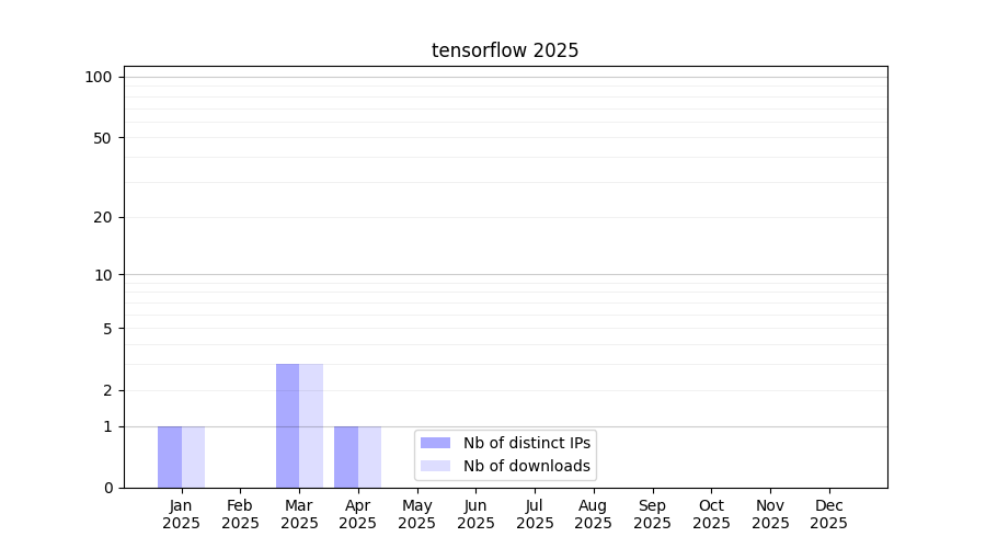 Number of downloads for software package tensorflow, year by year, from 2025 back to 2014 (years with no downloads are omitted):