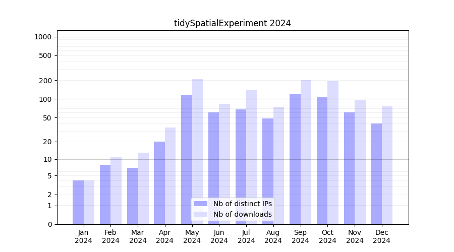 Number of downloads for software package tidySpatialExperiment, year by year, from 2025 back to 2014 (years with no downloads are omitted):