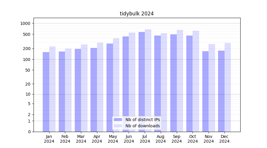 Number of downloads for software package tidybulk, year by year, from 2025 back to 2014 (years with no downloads are omitted):