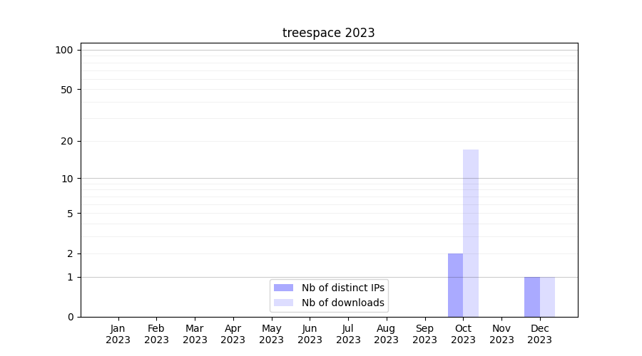 Number of downloads for software package treespace, year by year, from 2025 back to 2014 (years with no downloads are omitted):