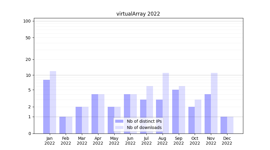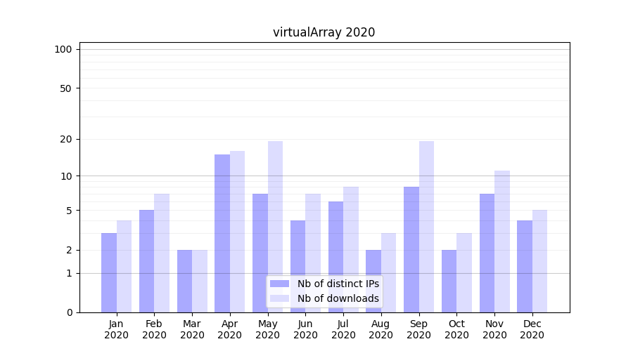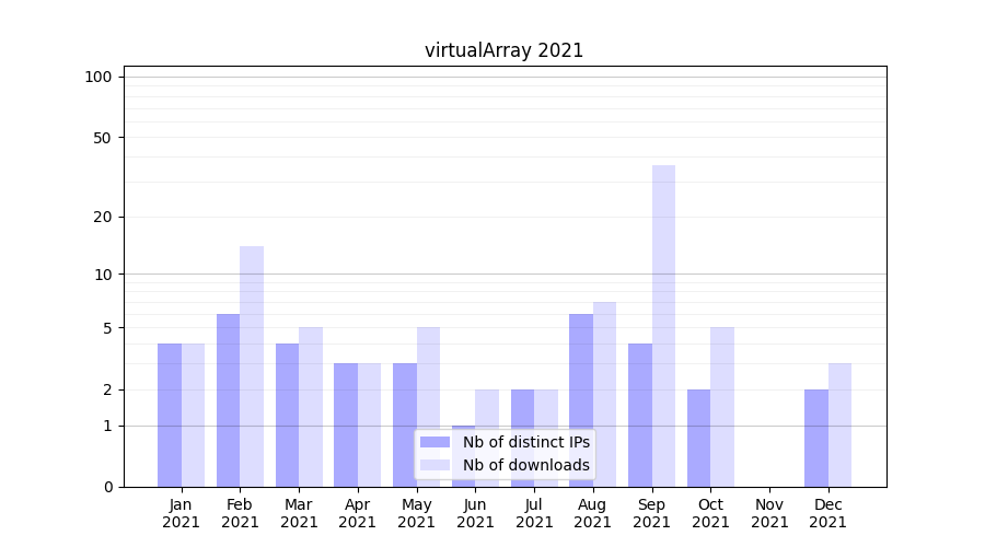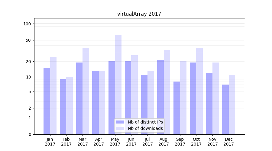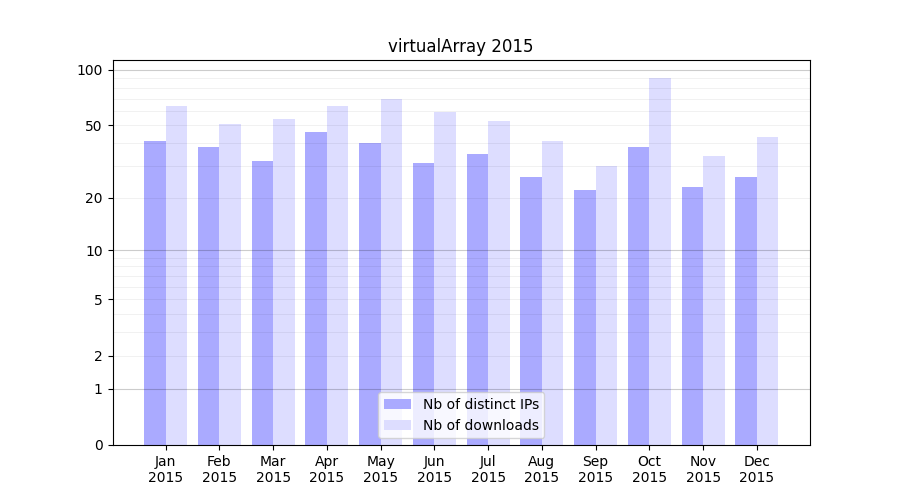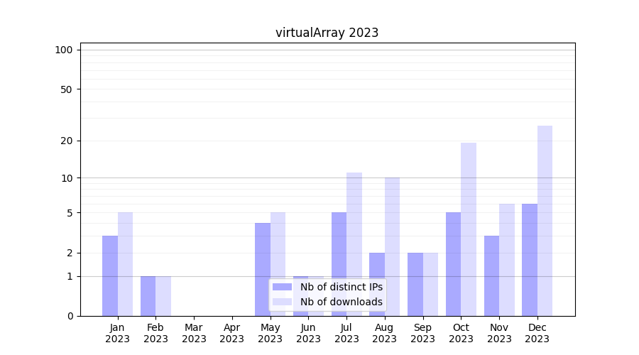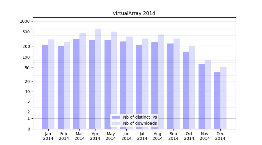 Number of downloads for software package virtualArray, year by year, from 2025 back to 2014 (years with no downloads are omitted):