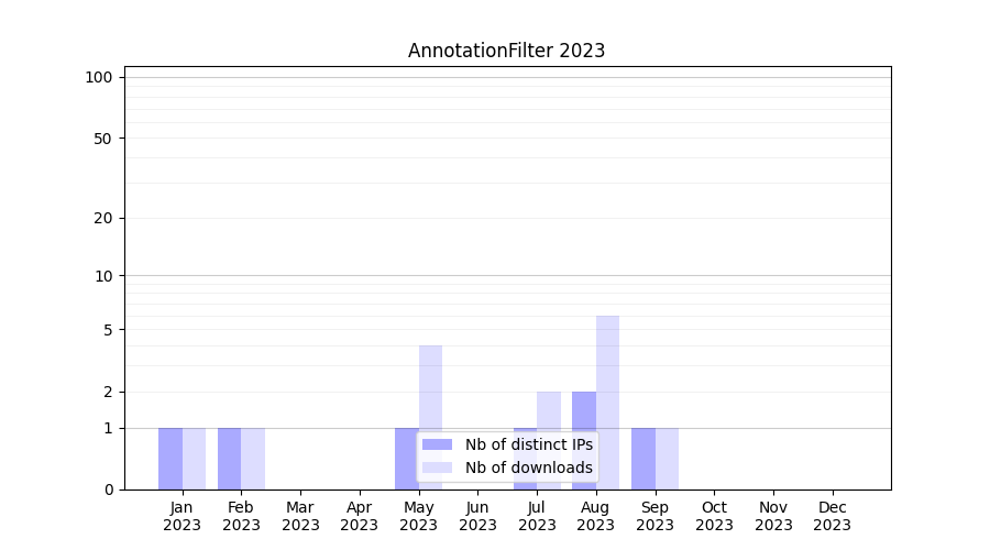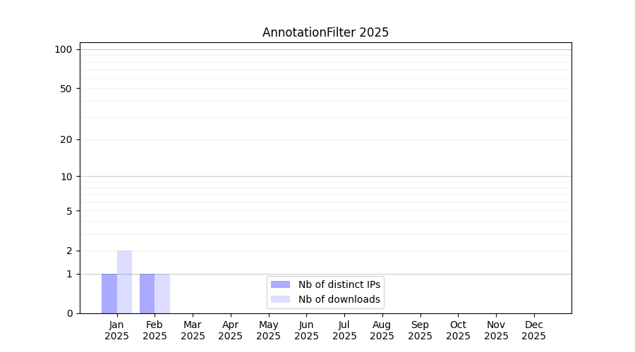 Number of downloads for annotation package AnnotationFilter, year by year, from 2025 back to 2014 (years with no downloads are omitted):