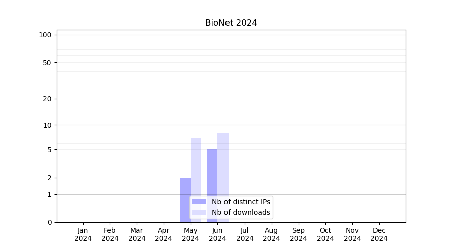 Number of downloads for annotation package BioNet, year by year, from 2025 back to 2014 (years with no downloads are omitted):