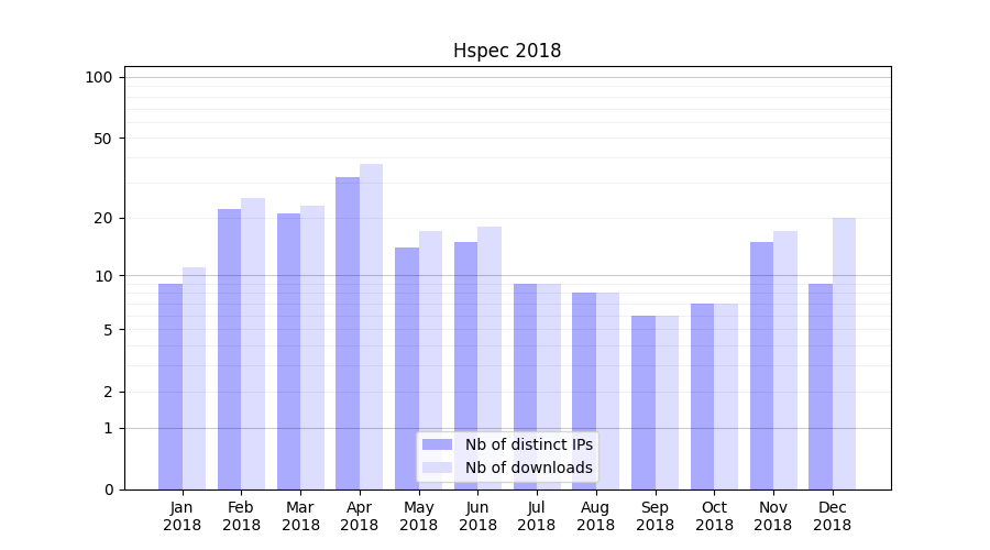 Number of downloads for annotation package Hspec, year by year, from 2025 back to 2014 (years with no downloads are omitted):