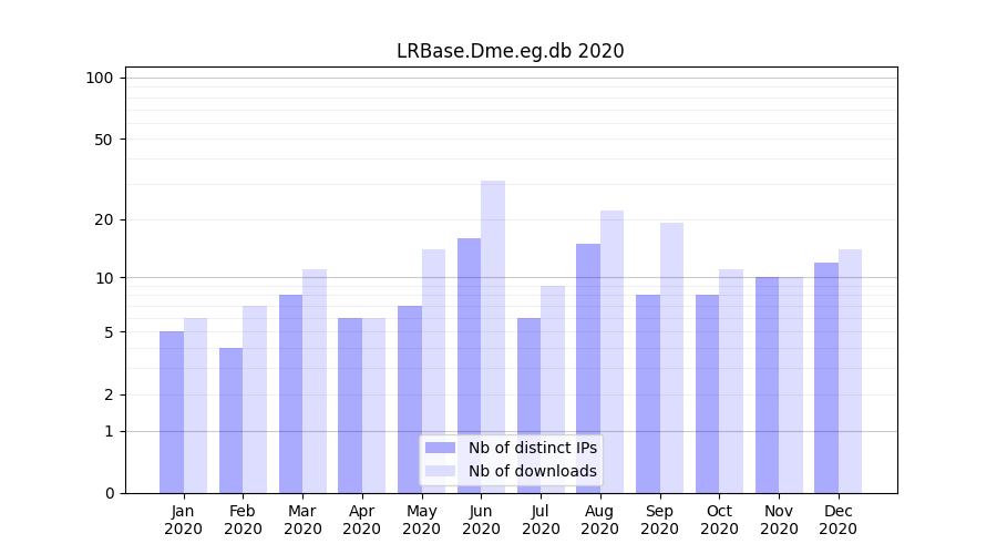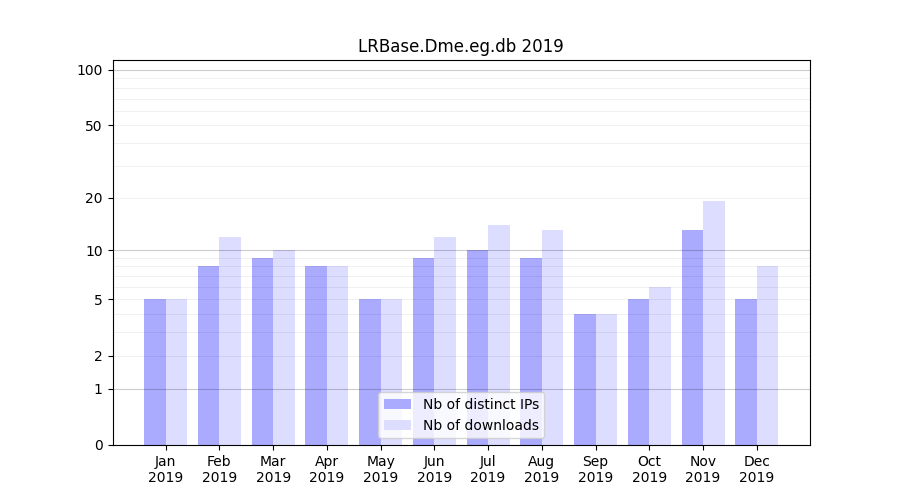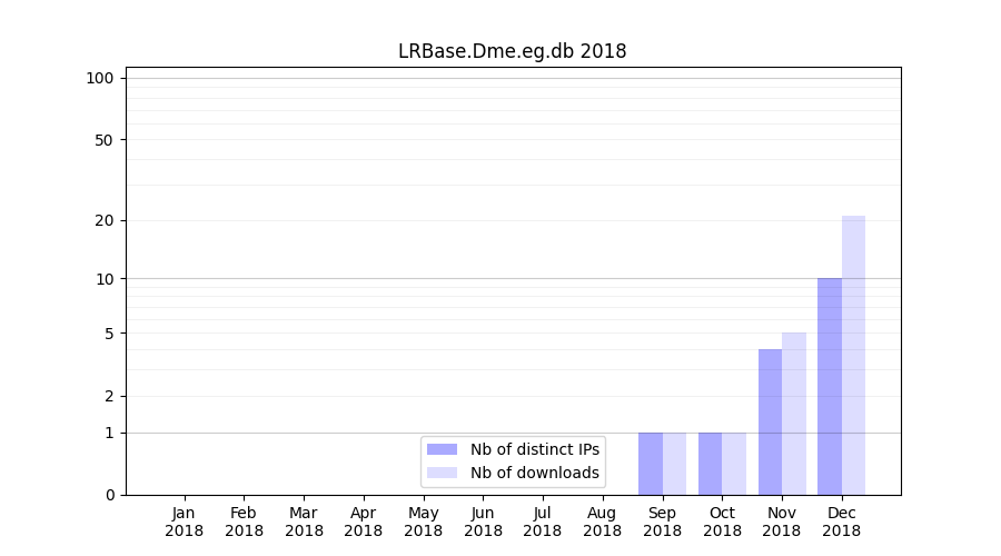Number of downloads for annotation package LRBase.Dme.eg.db, year by year, from 2025 back to 2014 (years with no downloads are omitted):