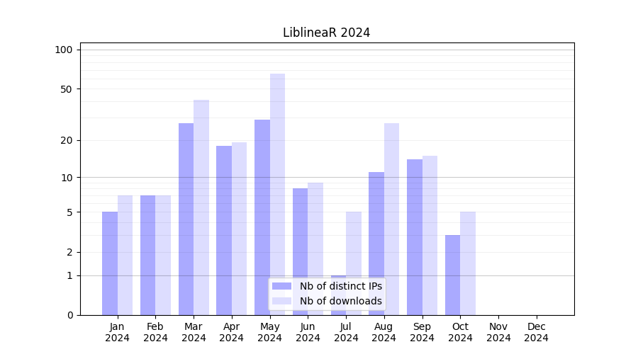 Number of downloads for annotation package LiblineaR, year by year, from 2025 back to 2014 (years with no downloads are omitted):