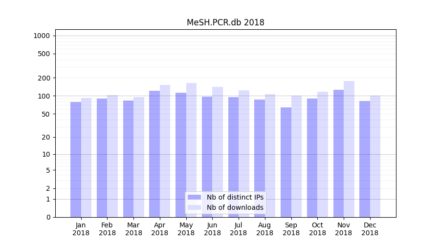 Number of downloads for annotation package MeSH.PCR.db, year by year, from 2025 back to 2014 (years with no downloads are omitted):