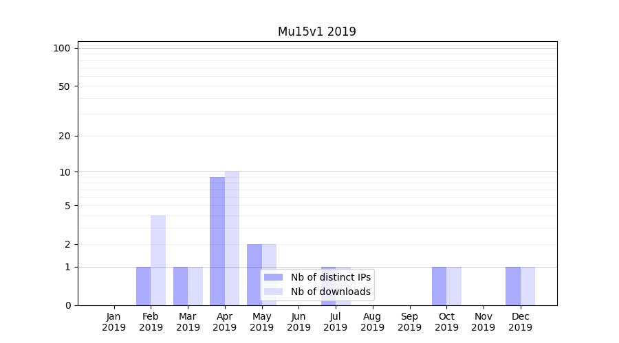Number of downloads for annotation package Mu15v1, year by year, from 2025 back to 2014 (years with no downloads are omitted):
