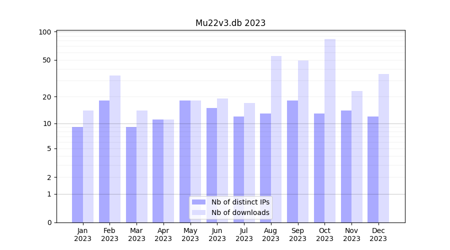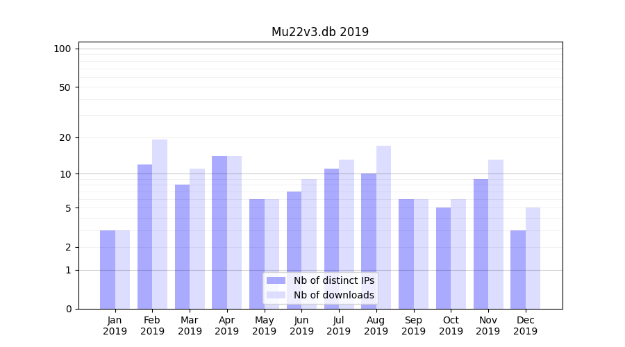 Number of downloads for annotation package Mu22v3.db, year by year, from 2025 back to 2014 (years with no downloads are omitted):