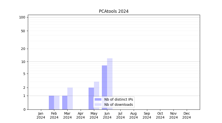 Number of downloads for annotation package PCAtools, year by year, from 2025 back to 2014 (years with no downloads are omitted):