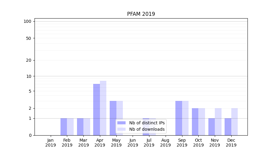 Number of downloads for annotation package PFAM, year by year, from 2025 back to 2014 (years with no downloads are omitted):