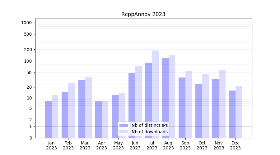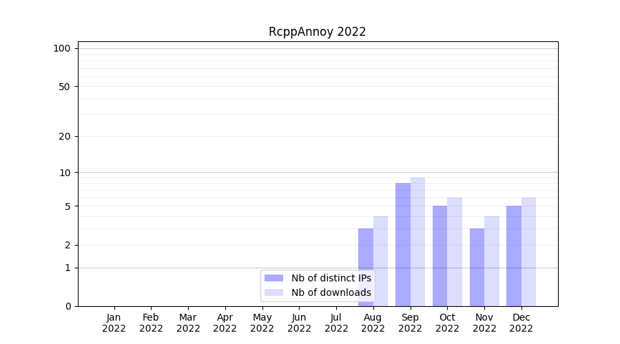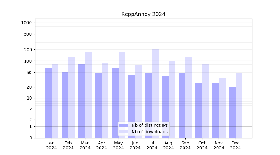 Number of downloads for annotation package RcppAnnoy, year by year, from 2025 back to 2014 (years with no downloads are omitted):