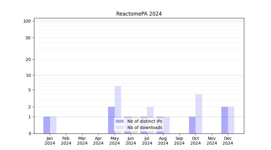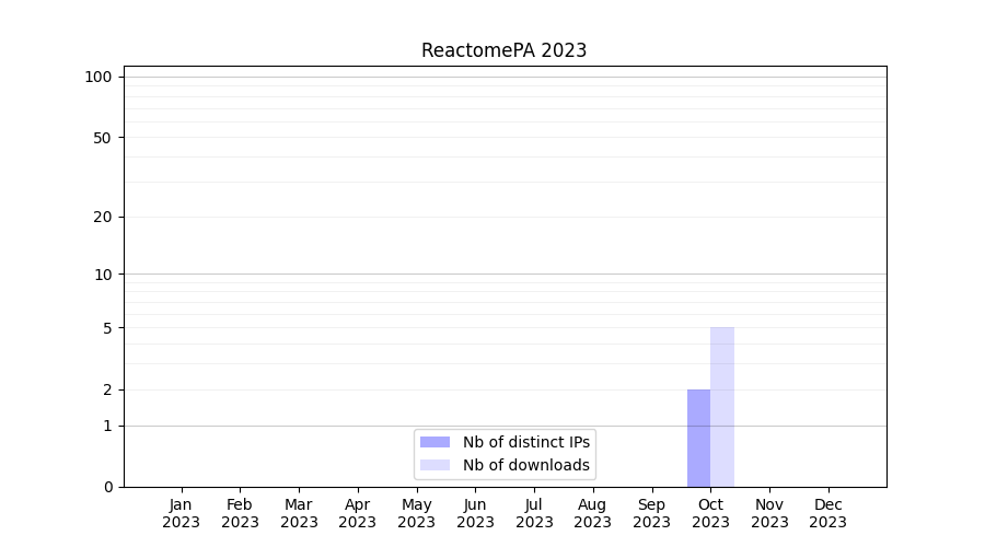 Number of downloads for annotation package ReactomePA, year by year, from 2025 back to 2014 (years with no downloads are omitted):