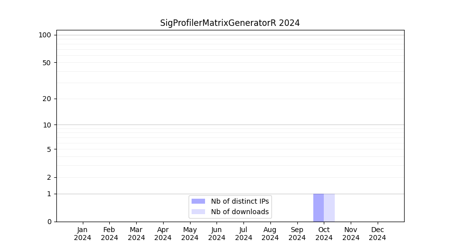 Number of downloads for annotation package SigProfilerMatrixGeneratorR, year by year, from 2025 back to 2014 (years with no downloads are omitted):
