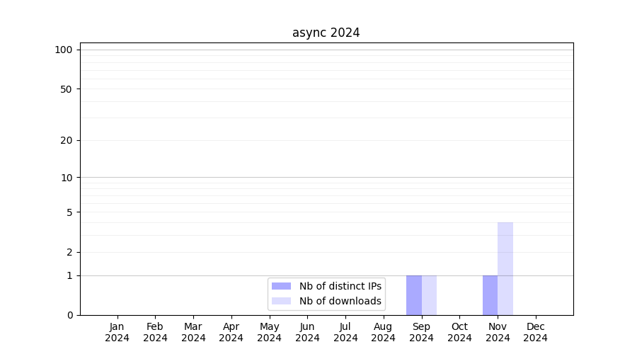 Number of downloads for annotation package async, year by year, from 2025 back to 2014 (years with no downloads are omitted):
