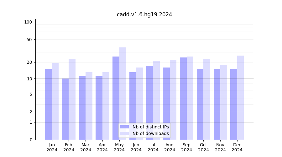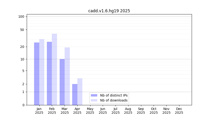 Number of downloads for annotation package cadd.v1.6.hg19, year by year, from 2025 back to 2014 (years with no downloads are omitted):