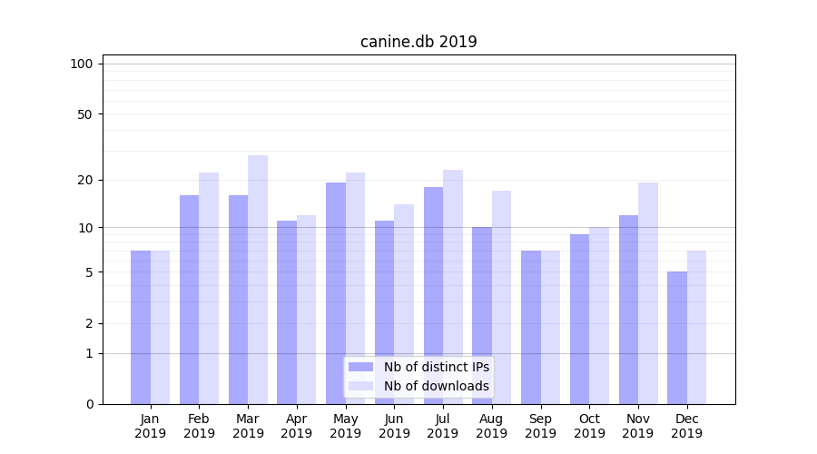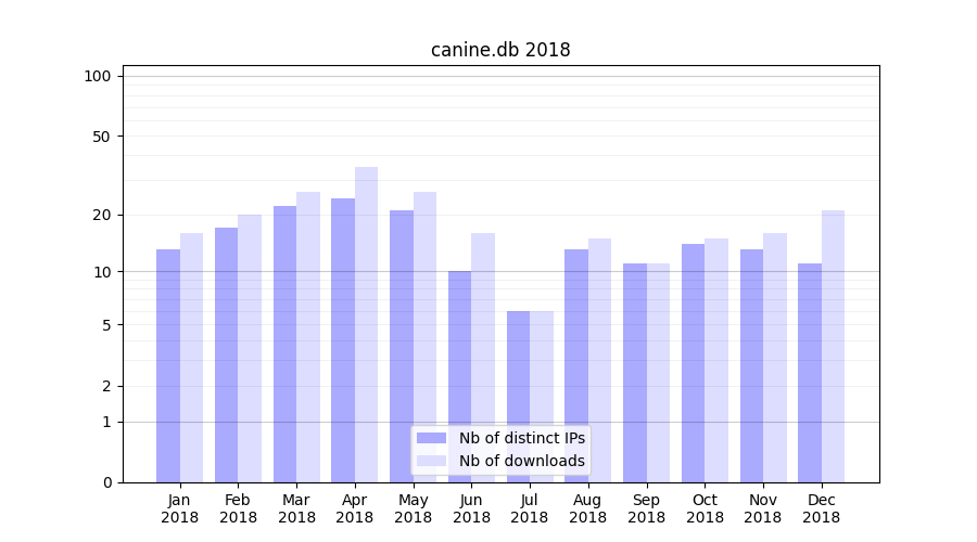 Number of downloads for annotation package canine.db, year by year, from 2025 back to 2014 (years with no downloads are omitted):