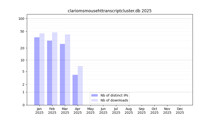 Number of downloads for annotation package clariomsmousehttranscriptcluster.db, year by year, from 2025 back to 2014 (years with no downloads are omitted):