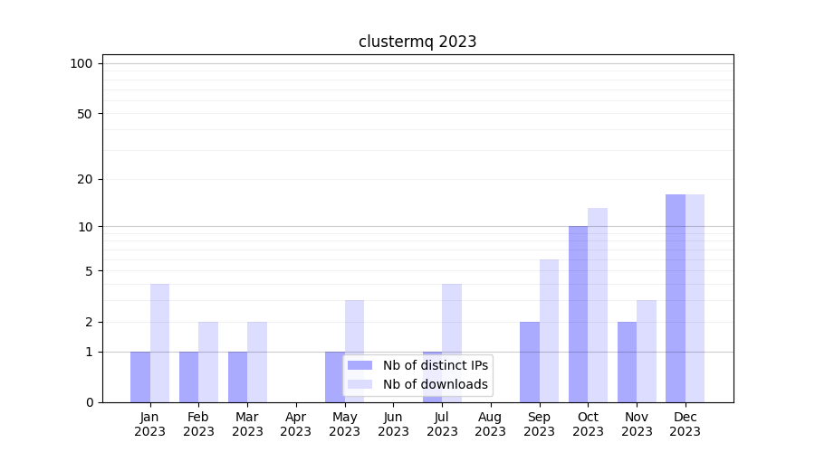 Number of downloads for annotation package clustermq, year by year, from 2025 back to 2014 (years with no downloads are omitted):