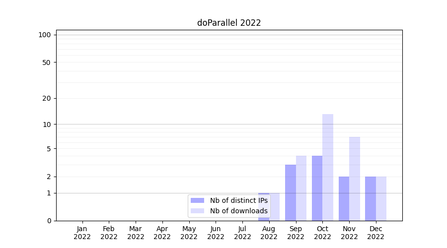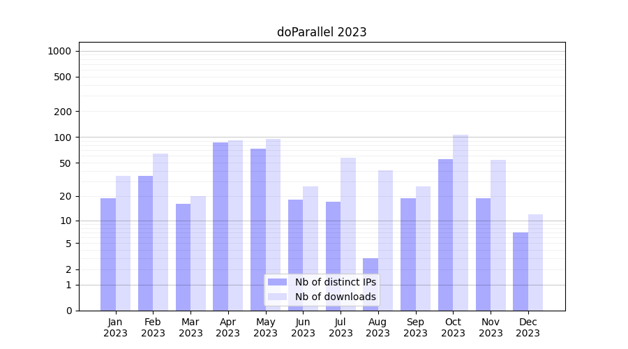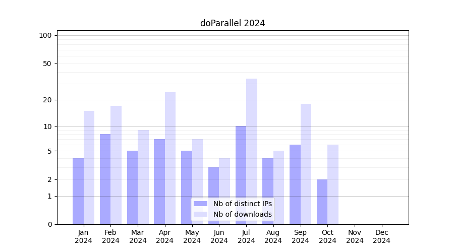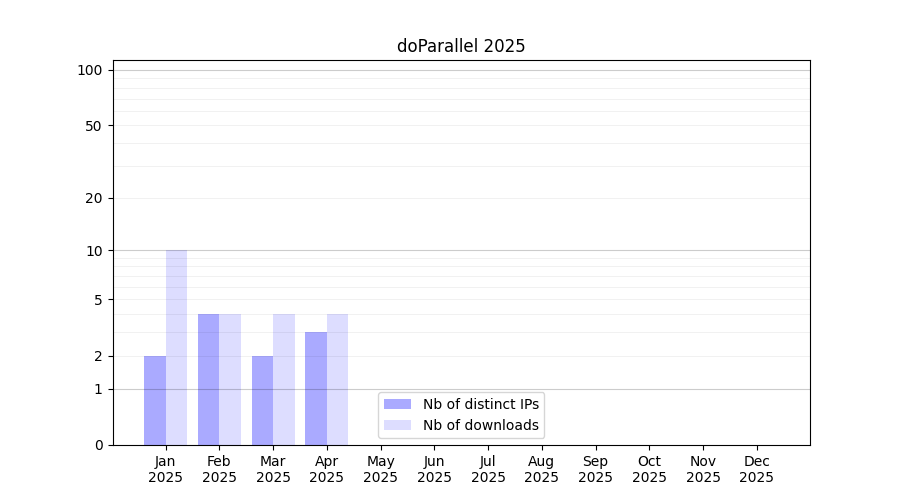 Number of downloads for annotation package doParallel, year by year, from 2025 back to 2014 (years with no downloads are omitted):
