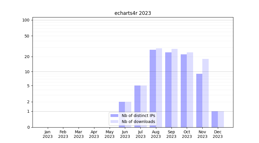 Number of downloads for annotation package echarts4r, year by year, from 2025 back to 2014 (years with no downloads are omitted):