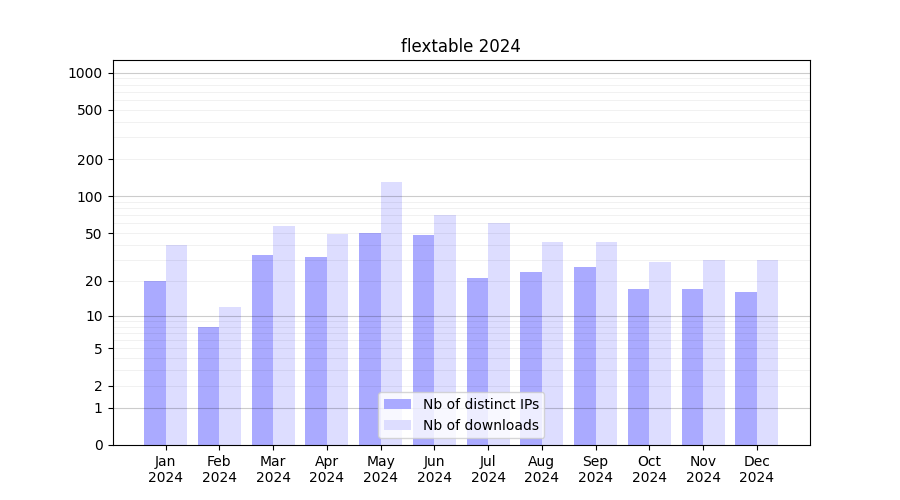 Number of downloads for annotation package flextable, year by year, from 2025 back to 2014 (years with no downloads are omitted):