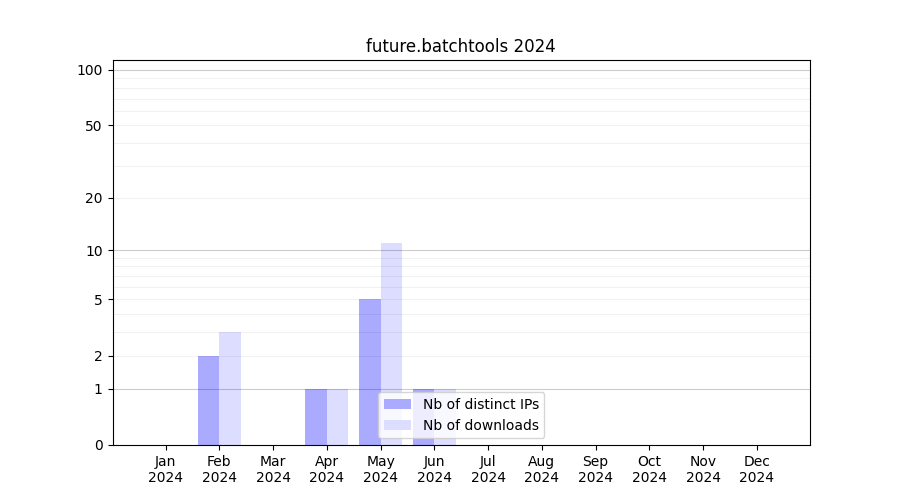Number of downloads for annotation package future.batchtools, year by year, from 2025 back to 2014 (years with no downloads are omitted):