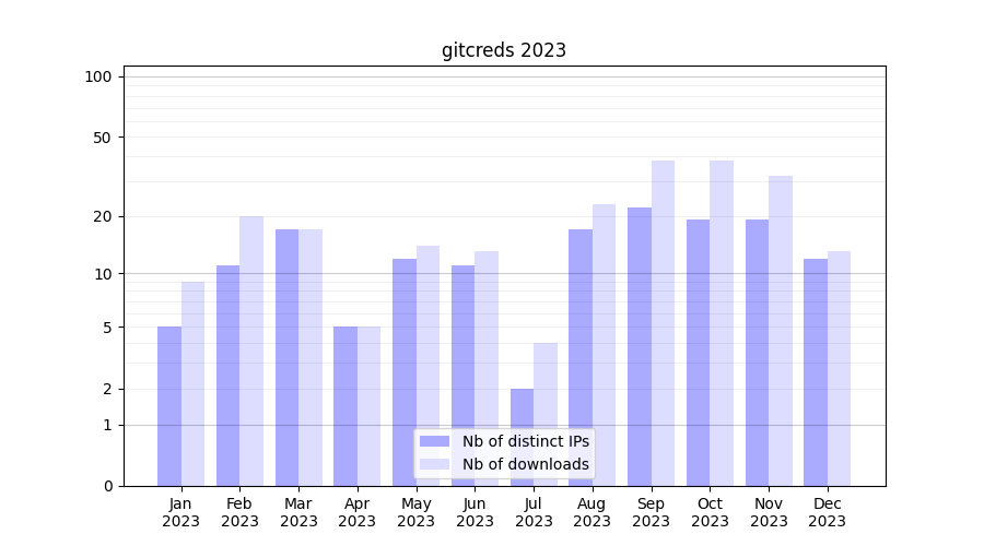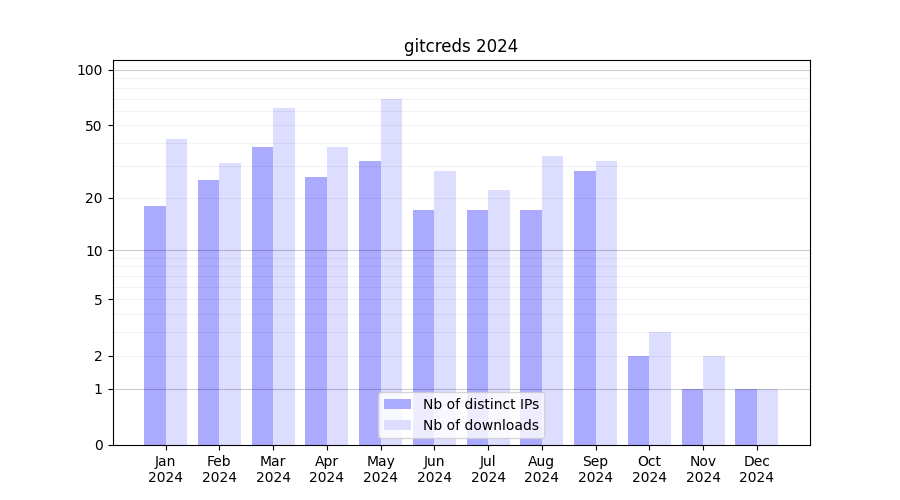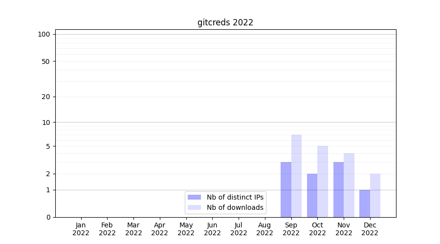 Number of downloads for annotation package gitcreds, year by year, from 2025 back to 2014 (years with no downloads are omitted):