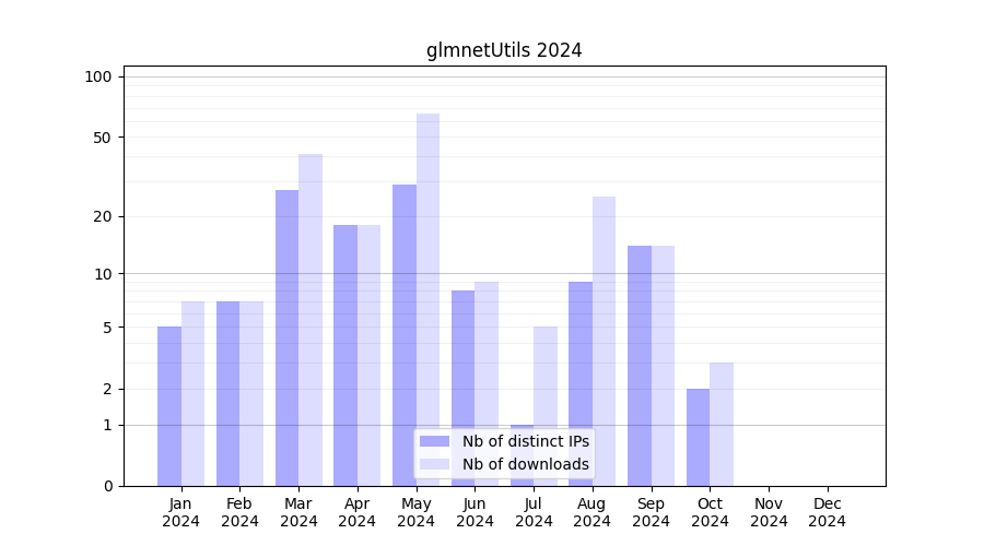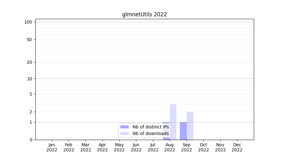 Number of downloads for annotation package glmnetUtils, year by year, from 2025 back to 2014 (years with no downloads are omitted):