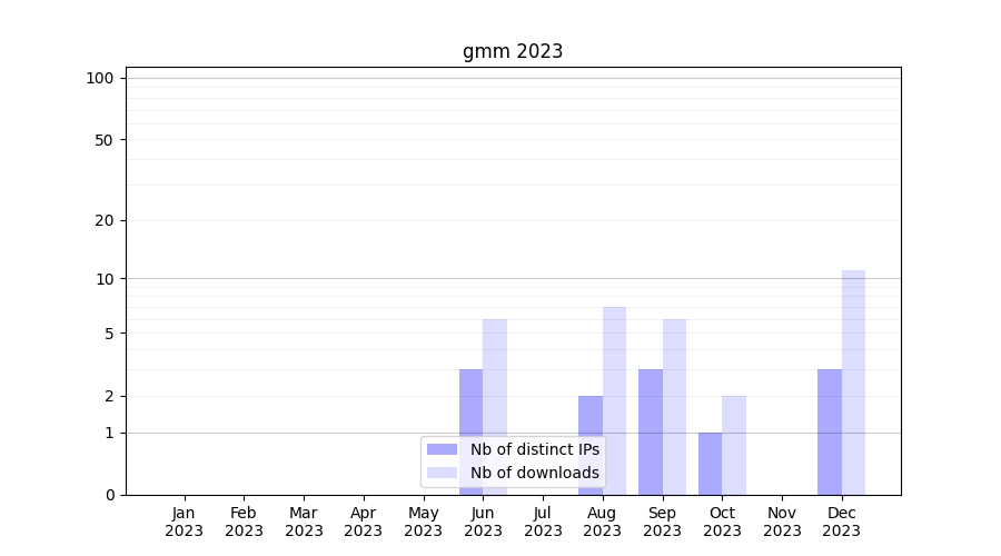 Number of downloads for annotation package gmm, year by year, from 2025 back to 2014 (years with no downloads are omitted):
