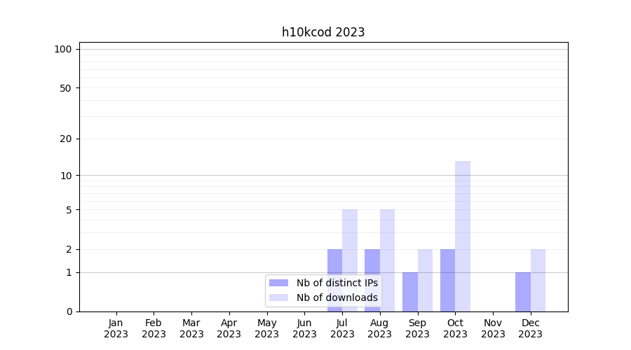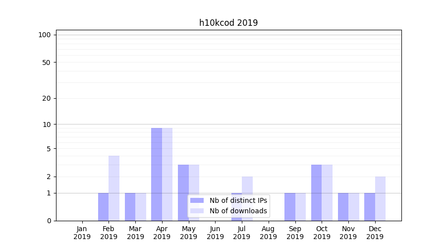 Number of downloads for annotation package h10kcod, year by year, from 2025 back to 2014 (years with no downloads are omitted):