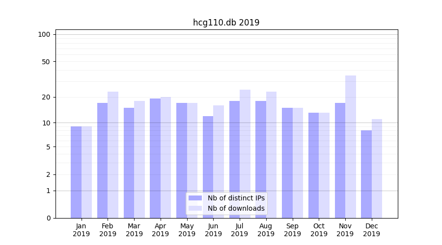 Number of downloads for annotation package hcg110.db, year by year, from 2025 back to 2014 (years with no downloads are omitted):