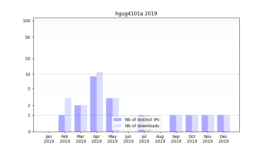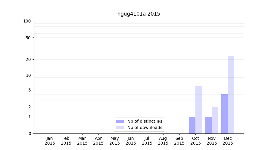 Number of downloads for annotation package hgug4101a, year by year, from 2025 back to 2014 (years with no downloads are omitted):