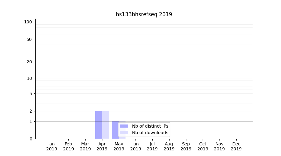 Number of downloads for annotation package hs133bhsrefseq, year by year, from 2025 back to 2014 (years with no downloads are omitted):