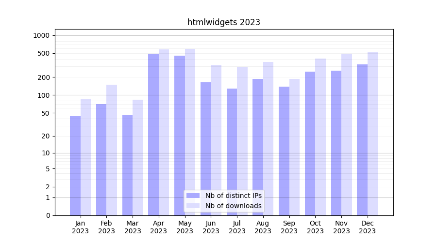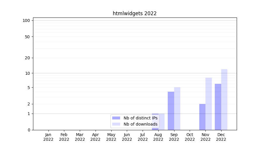 Number of downloads for annotation package htmlwidgets, year by year, from 2025 back to 2014 (years with no downloads are omitted):