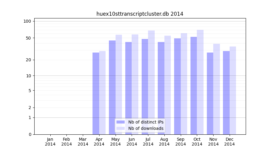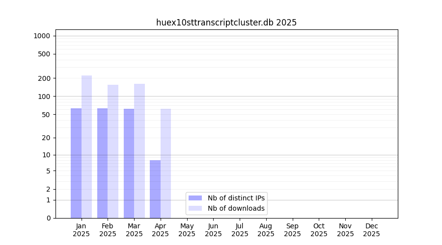 Number of downloads for annotation package huex10sttranscriptcluster.db, year by year, from 2025 back to 2014 (years with no downloads are omitted):