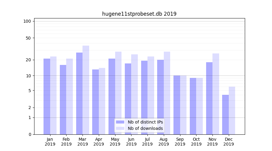 Number of downloads for annotation package hugene11stprobeset.db, year by year, from 2025 back to 2014 (years with no downloads are omitted):