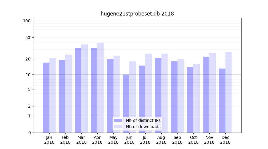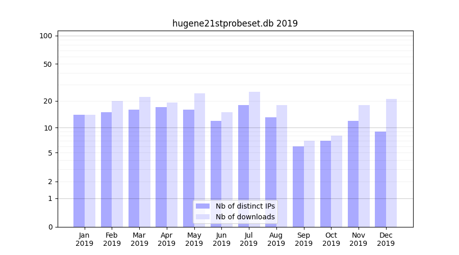 Number of downloads for annotation package hugene21stprobeset.db, year by year, from 2025 back to 2014 (years with no downloads are omitted):