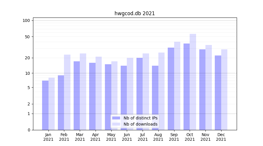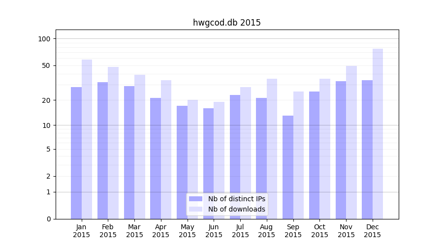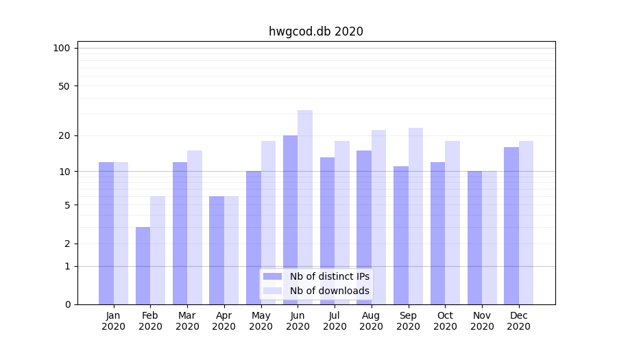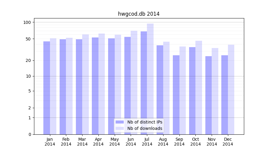 Number of downloads for annotation package hwgcod.db, year by year, from 2025 back to 2014 (years with no downloads are omitted):