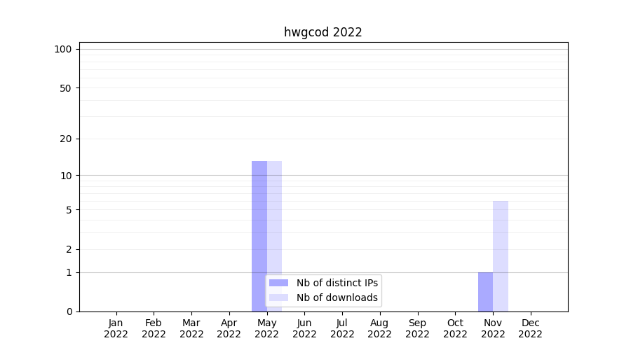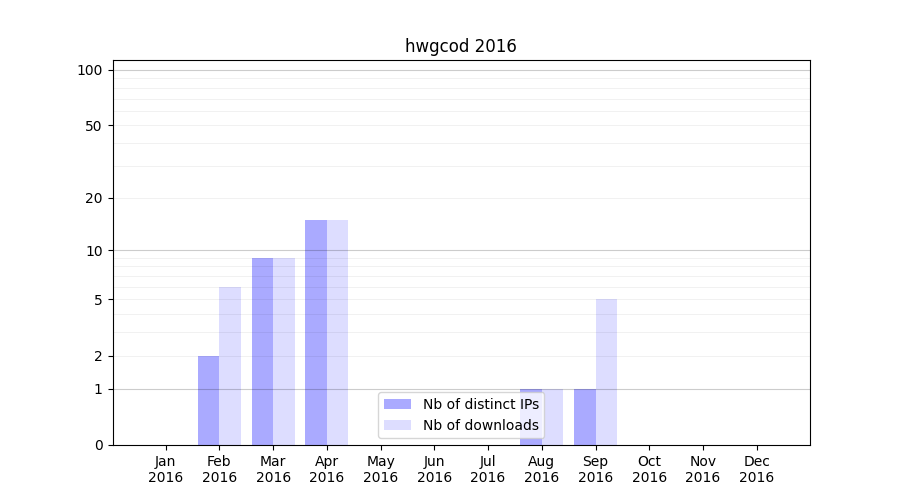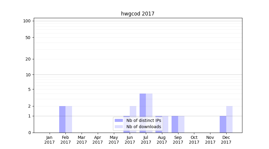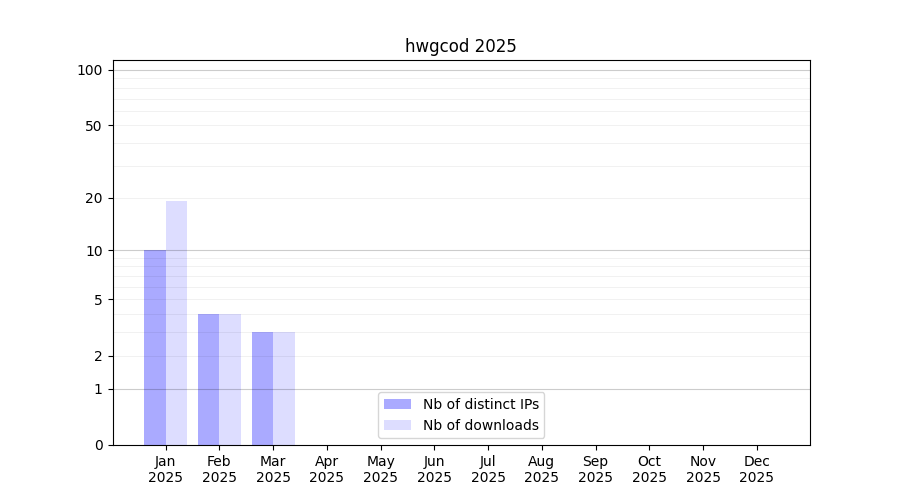Number of downloads for annotation package hwgcod, year by year, from 2025 back to 2014 (years with no downloads are omitted):