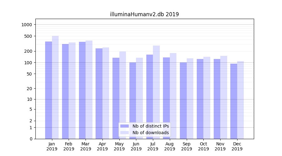 Number of downloads for annotation package illuminaHumanv2.db, year by year, from 2025 back to 2014 (years with no downloads are omitted):