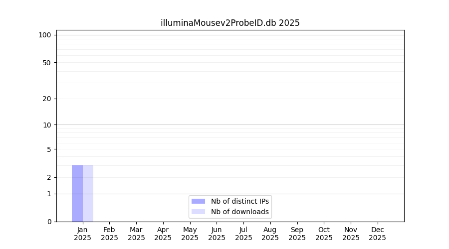 Number of downloads for annotation package illuminaMousev2ProbeID.db, year by year, from 2025 back to 2014 (years with no downloads are omitted):